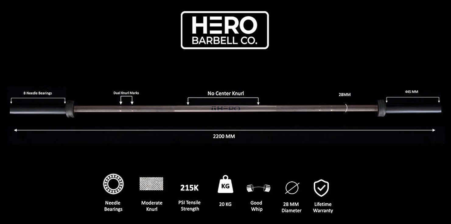 The Legend Bar from Hero Barbell delivers the epitome of strength, versatility, and reliability in functional fitness. With 215k psi tensile strength, needle bearings for spin, and moderate knurling, the bar is built to go the distance and is backed by a lifetime warranty.