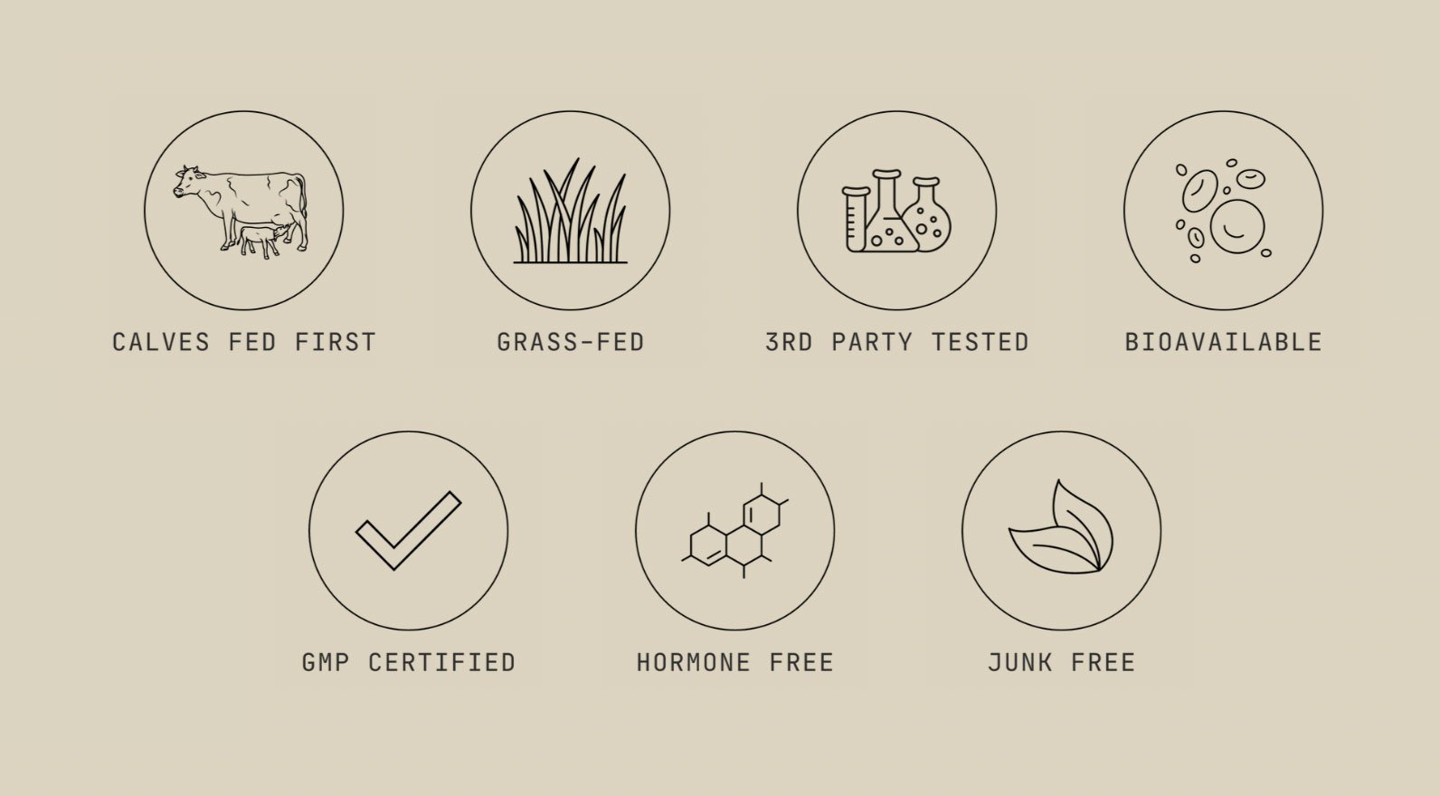 We collect first milking colostrum from grass-fed U.S. dairy cows within the first 4 to 6 hours after the calf is born and it gets theirs. This first milking approach gives our colostrum the highest concentration of bioactives to support immunity, gut health, radiant skin + hair and athletic performance.
