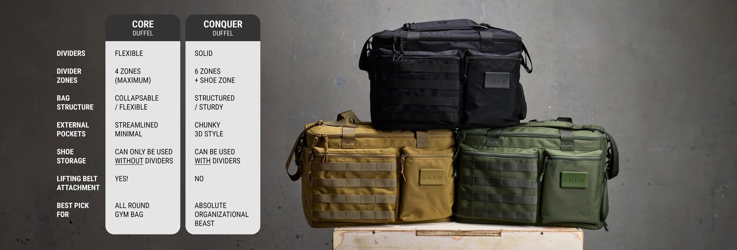 The CONQUER Duffel dividers are more solid and click in place with magnets. The CORE Duffel concertina-style dividers are more flexible. Ideal for flat packing away.