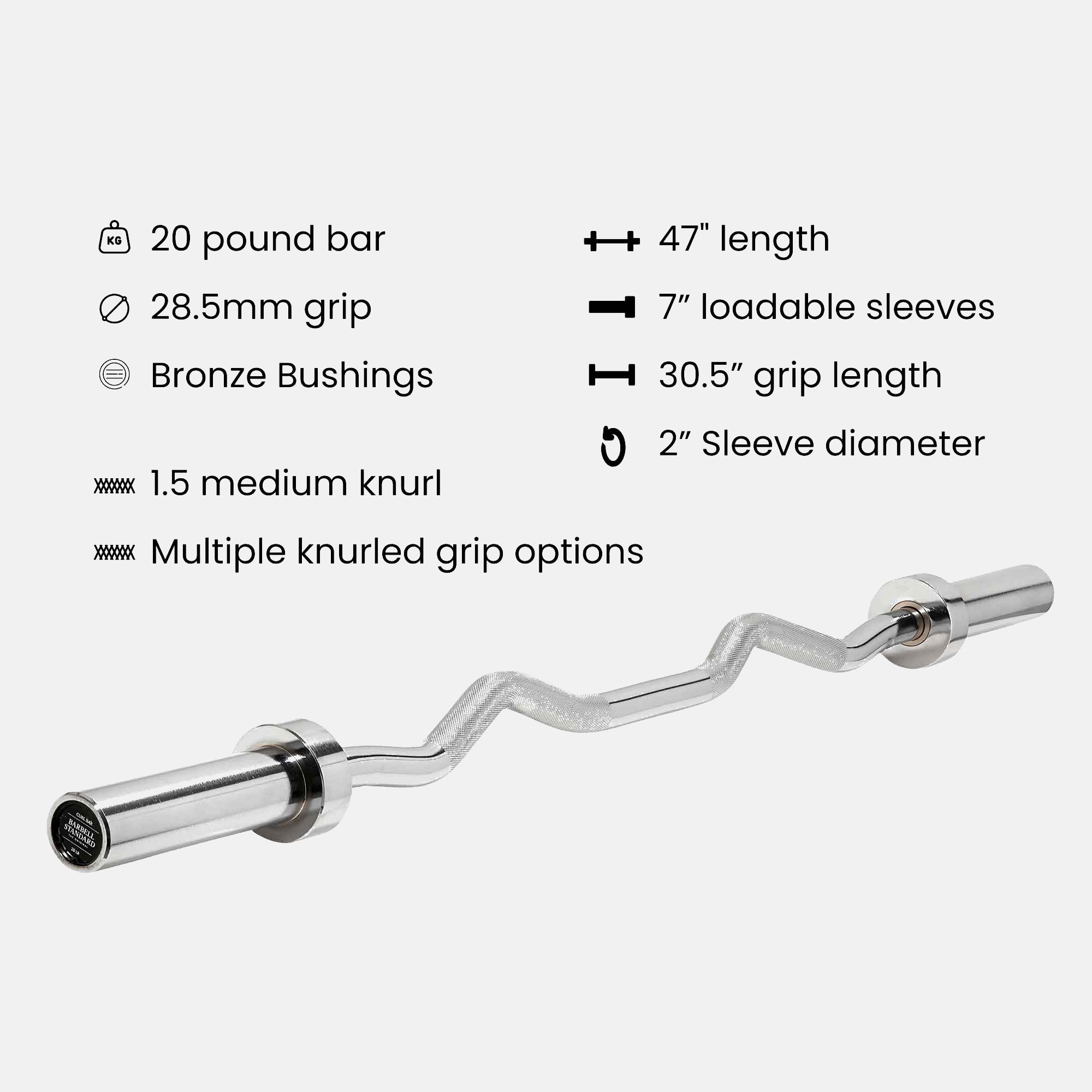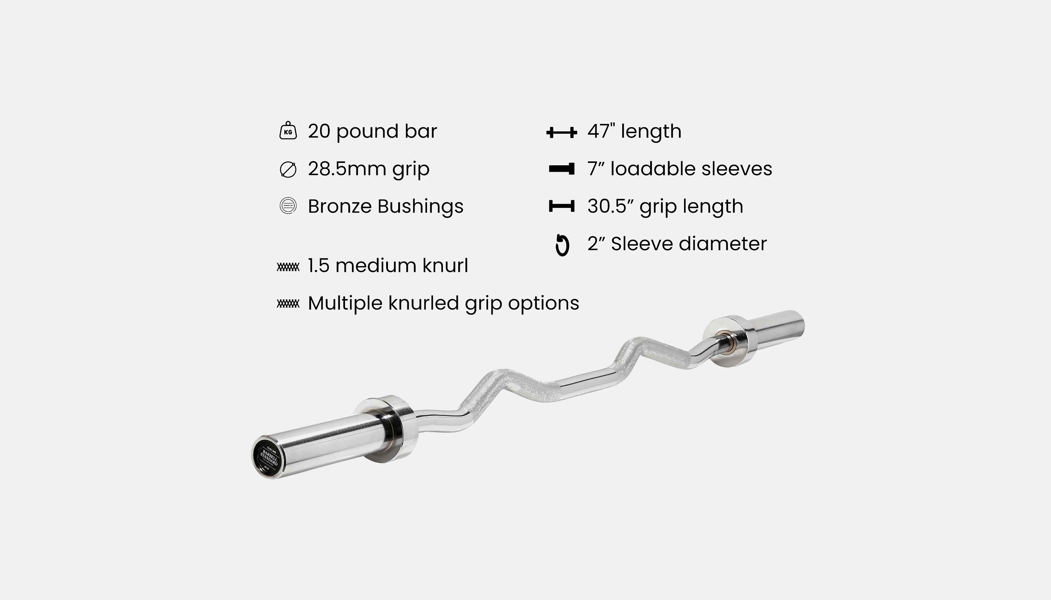 Precision medium knurling provides a firm yet comfortable grip, ensuring control throughout your workout. Versatile Perfect for bicep curls, tricep extensions, curl bars are also a great tool for lifts like military press, upright rows, floor press, squats, many other exercises, making it a great first bar for any home gym.